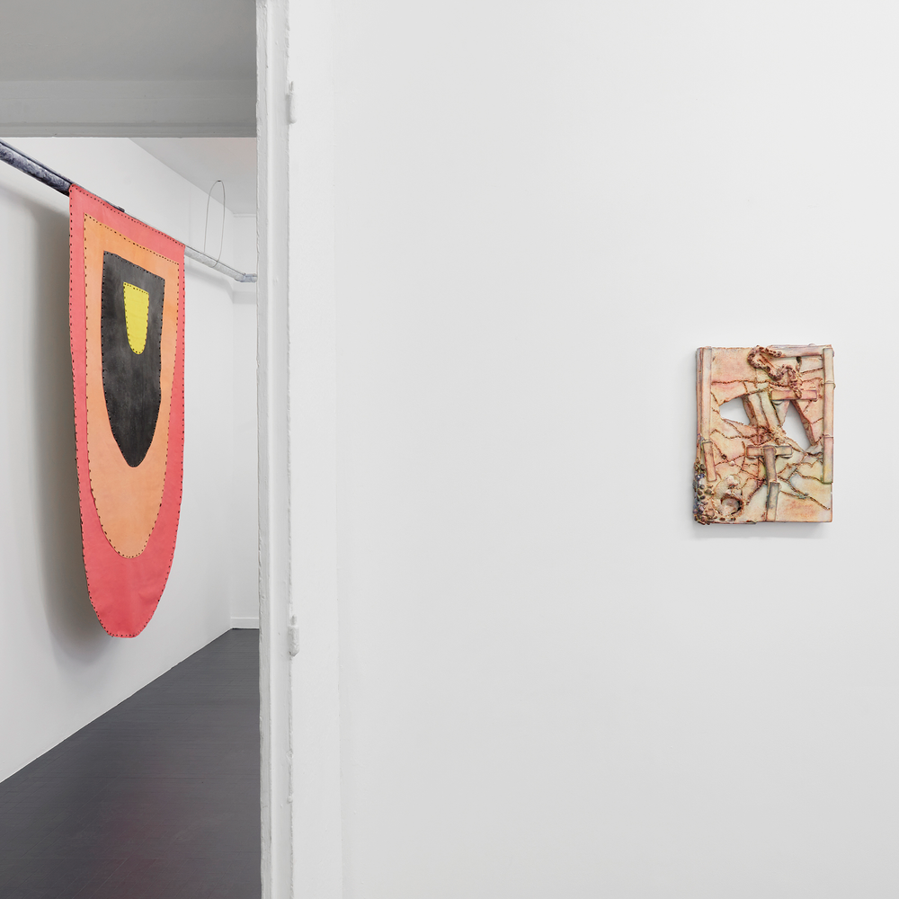 Ici aussi, il ne s’agit pas tant de tromper mais d’évoquer en dévoyant. Des procédés de sculpture sont mis en évidence : couler, pétrir, brasser, talocher, coudre, enrober, teinter dans la masse, ferrer…exacerbant des gestes plus communs et plus « tendres » en peinture : tendre, agrafer, enduire, appliquer, (re)couvrir, laisser sécher, vernir (ou pas), dégrafer, rouler. Les artistes exposé.e.s portent une attention à la matérialité du support, à la fabrication de l’objet pictural, plus qu’à l’application de surface couvrante, de peinture, au sens de couches, unique ou successives, de pigments et de liant.