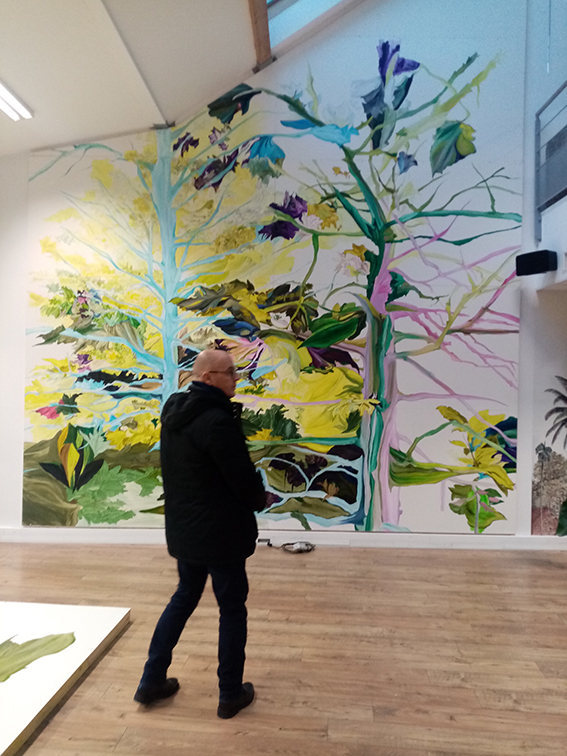 Le montage relève alors d’un sport d’équipe où chacun trouve une place. Certains tableaux, des tondis, sont accrochés dans des niches en hauteur à l’accès périlleux, quant d’autres reposent sans effort sur des tasseaux en sapin longeant le mur. Un autre peinture sur panneaux d’environ 20 m2 repose au sol, une œuvre de second choix sans doute qui aurait tout aussi bien pu se substituer à celle habillant le plus grand mur de l’espace. Étrange logique que de réaliser deux œuvres monumentales pour en requestionner le choix sur place. Trancher dès l’esquisse était out of the picture. Quelques photographies de paysage de fougères exotiques sont pincées sur des panneaux de bois brut, posés avec une simplicité déconcertante sur d’improbables pupitres de musicien. La nonchalance évidente dont témoignent certaines surfaces d’huile en cours de séchage jure avec l’urgence de la mise en place. Bertrand s’affaire tel un maestro sans baguette. L’acheminement de ses œuvres est digne du tournage de « Fitzcarraldo »(1982), film de Werner Herzog, où le protagoniste, pour gagner quelques semaines de voyage, s’engage dans le projet fou de faire traverser son bateau via la montagne afin construire à temps son opéra dans la jungle.
